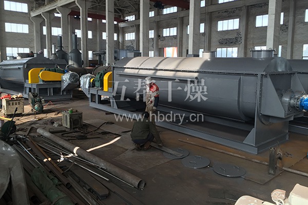 ● 用導(dǎo)熱油做熱介質(zhì),槳葉干燥機可完成低溫煅燒工作。如:二水硫酸鈣(Ca2SO4·2H2O)煅燒轉(zhuǎn)化為半水硫酸鈣(Ca2SO4·1/2H2O)。碳酸氫鈉(NaHCO3)經(jīng)煅燒 轉(zhuǎn)化為純堿(Na2CO3)等。