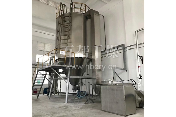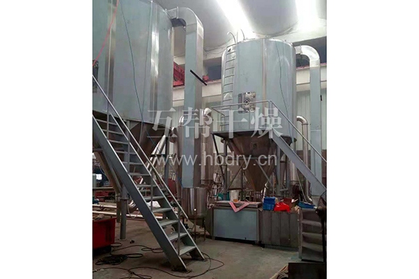 空氣經(jīng)過過濾和加熱,進入干燥器頂部空氣分配器,熱空氣呈螺旋狀均勻地進入干燥室。料液經(jīng)塔體頂部的高速離心霧化器,(旋轉)噴霧成極細微的霧狀液珠,與熱空氣并流接觸,在極短的時間內可干燥為成品。成品連續(xù)地由干燥塔底部和旋風分離器中輸出,廢氣由風機排空。